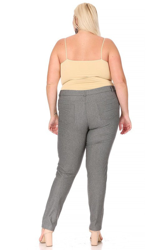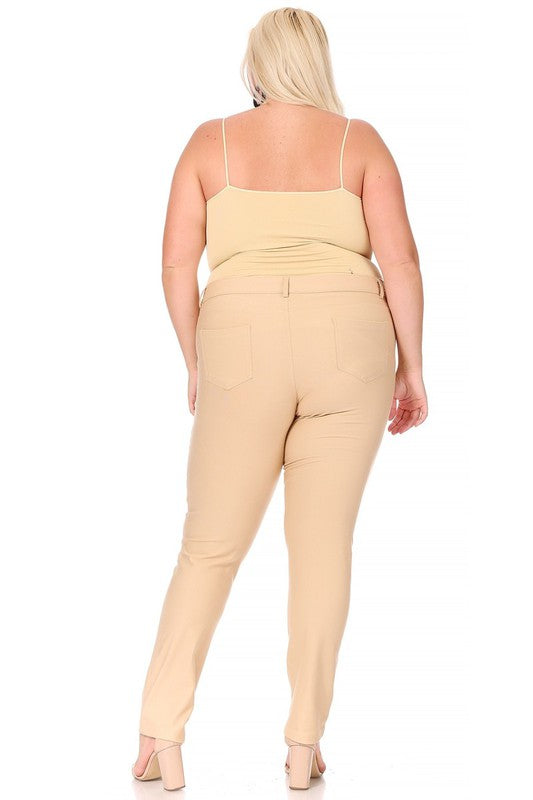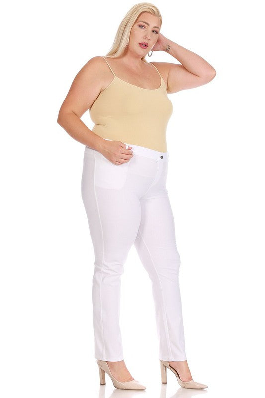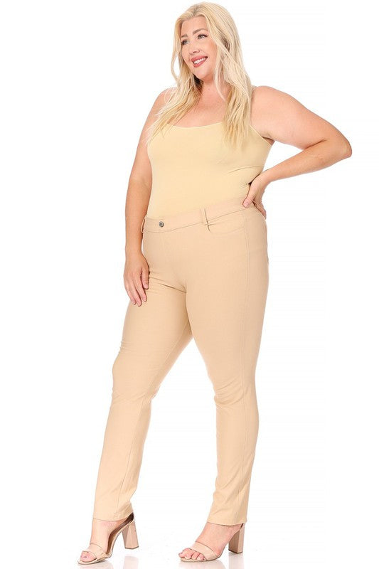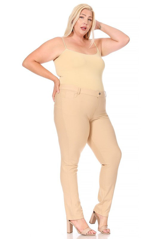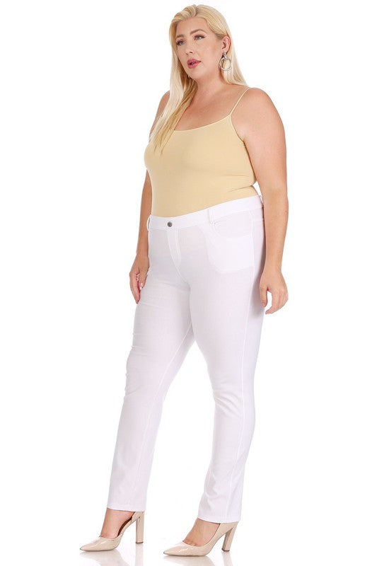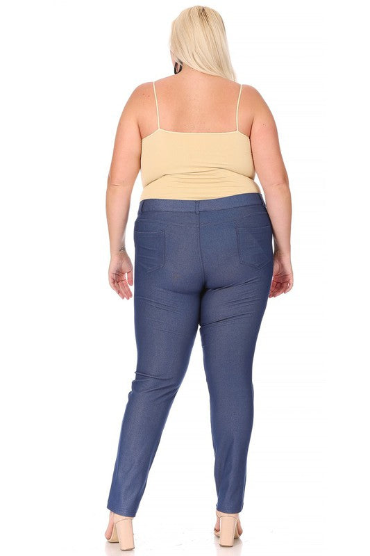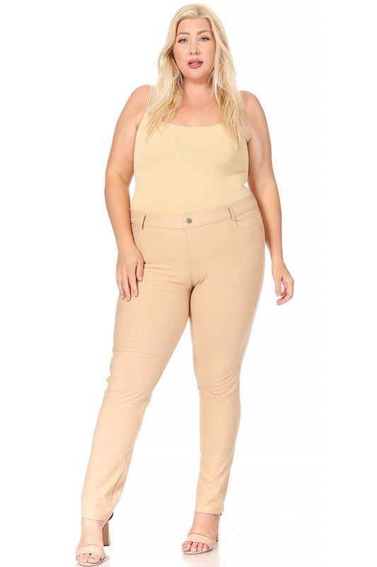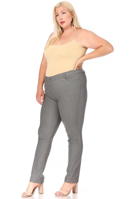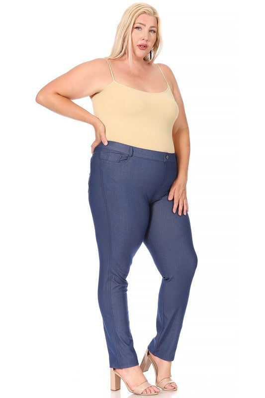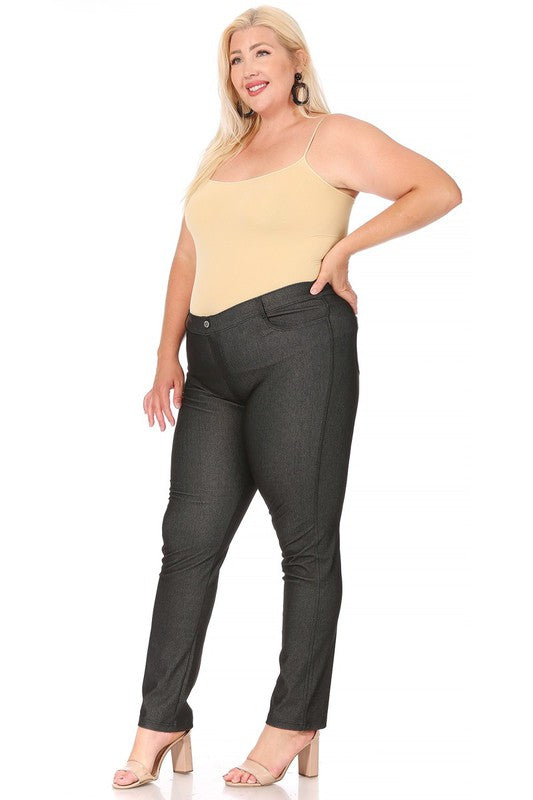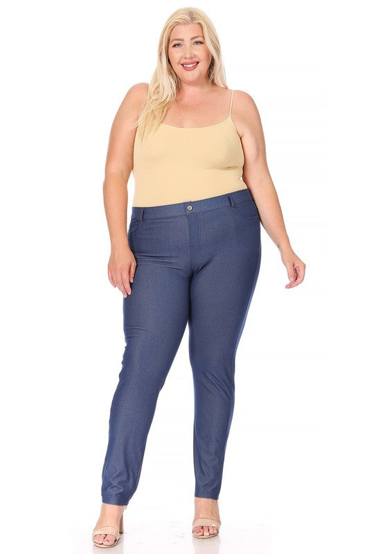 Plus size, stretchy, pull up, full length jeggings with belt loops, pockets, and button accent